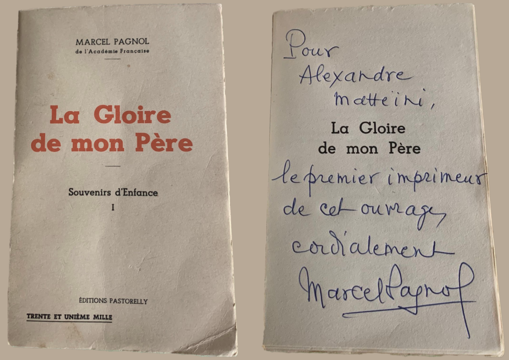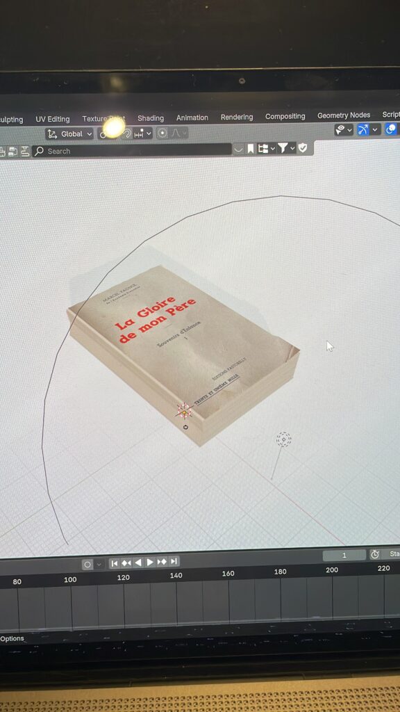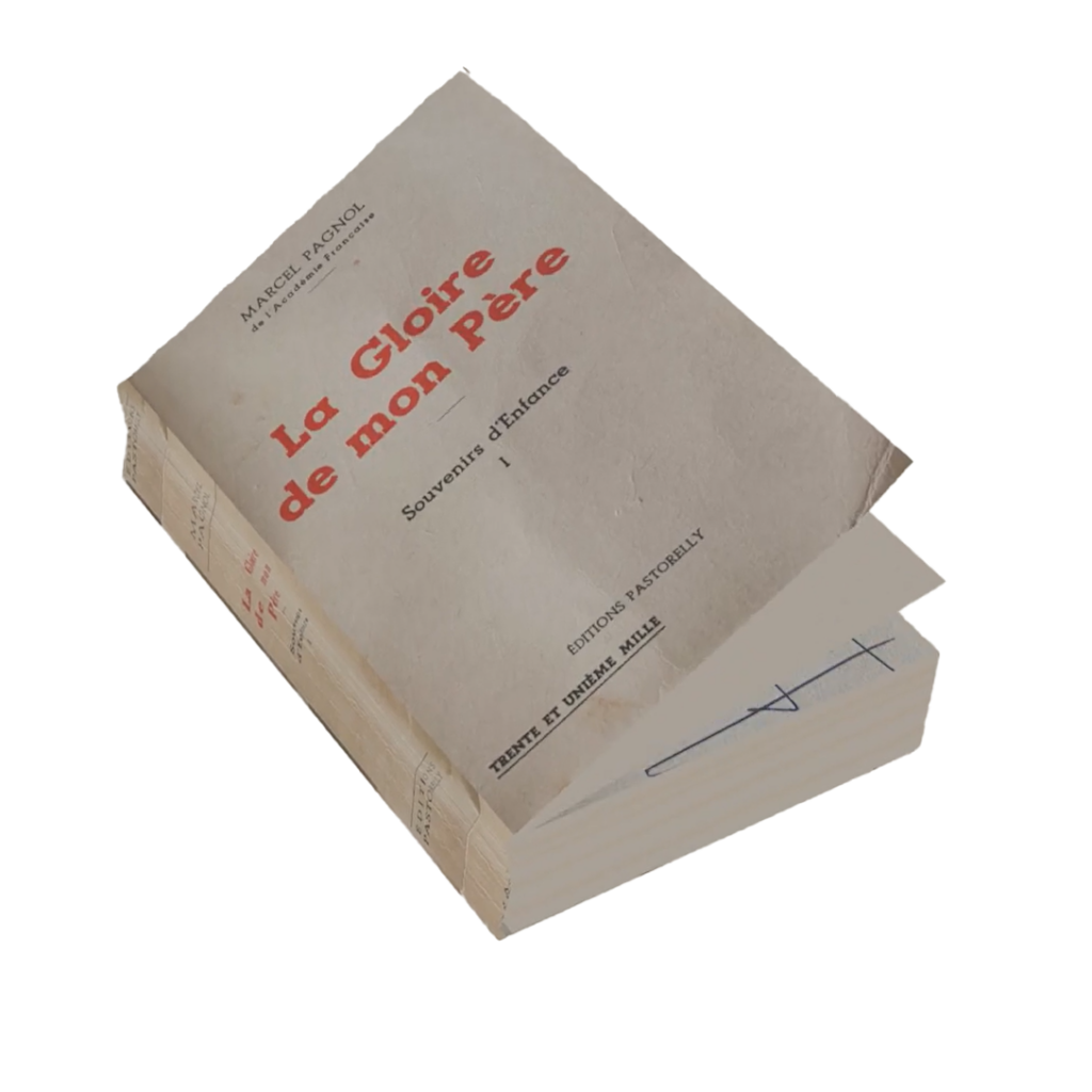 Cette modélisation 3D s’inscrit dans une démarche de mémoire et de transmission. Elle représente le premier ouvrage de Marcel Pagnol, La Gloire de mon père, dans son exemplaire dédicacé de la main de l’auteur à mon oncle, qui fut son tout premier imprimeur.
